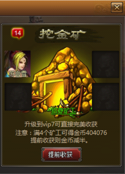 通过点击界面图标【挖金矿】,点击图标后打开挖金矿界面: