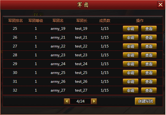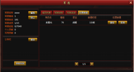 创建军团成功后,创建该军团的玩家自动成为军团长,可通过处理申请来接受其他玩家的申请或拒绝其他玩家的申请。