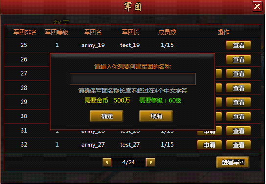 点击创建军团可进入创建军团界面,创建军团需要500万金币,等级需求60级以上,军团名称最多4个中文字符。