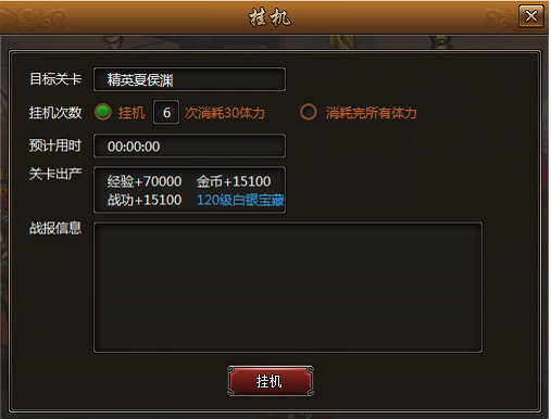 街机三国副本挂机 点击副本关卡图上的【挂机】按钮: