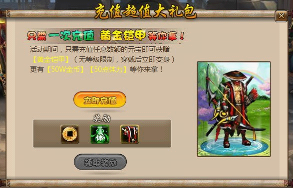 黄金铠甲x1(无等级限制,穿戴后立即变换高端造型)、50W金币、50点体力