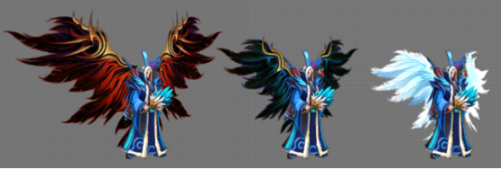 2、 翅膀分为绿、蓝、紫、金、暗金等等颜色级别,并拥有不同的外形变化。