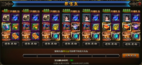 1、 每充值88元宝、588元宝、888元宝、2888元宝、5888、8888元宝可获得不同档次的物品奖励;