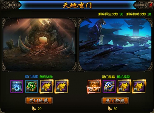 1、每日可探宝次数50次,协助次数10次,每次花费少量的元宝可获得不同档次的物品奖励;