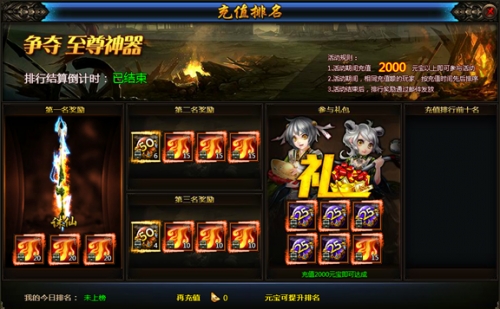 1、活动当天开启全服充值排名活动,充值满2000元宝以上,即可参与该活动。