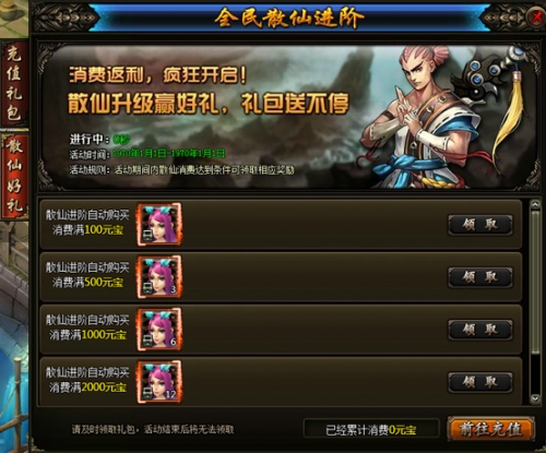 2、散仙好礼:活动期间内散仙进阶消费达到对应额度即可领取奖励(需要在散仙强化界面内购买强化丹或进阶丹才计入消费额度)