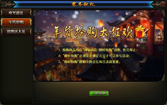 2、“限时抢购”必须是非绑定元宝才可以参与活动,物品均为绑定