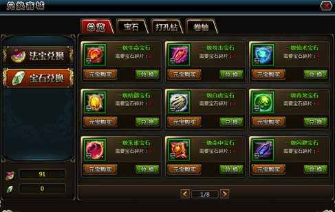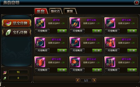 兑换商城可以通过点击屏幕右上方的快捷按钮进入,兑换的货币分为法宝碎片和宝石碎片两类。