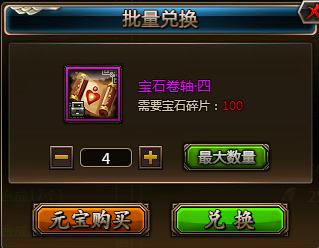 宝石从低到高共分8级,合成4级宝石开始需要使用宝石合成卷轴,卷轴可通过兑换商城宝石碎片进行兑换或用元宝直接购买。宝石数量不足时玩家可以使用立即合成按钮补差价合成高级宝石。
