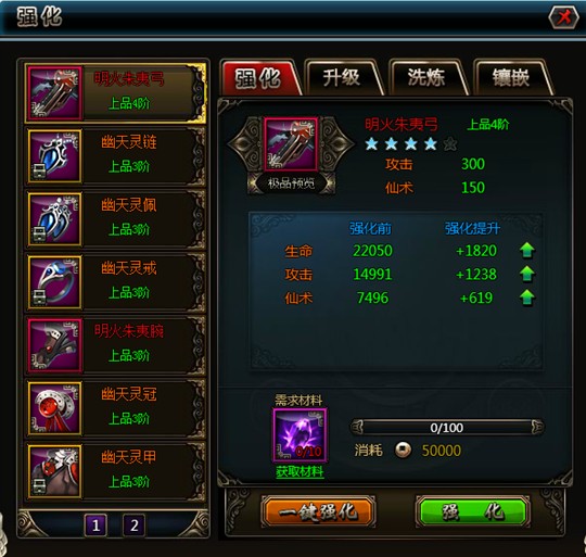 装备强化采用品质+阶数来替代了常规单一的强化等级,目前共分凡品、中品、上品、仙品4种品质,每品分为5阶强化等级。