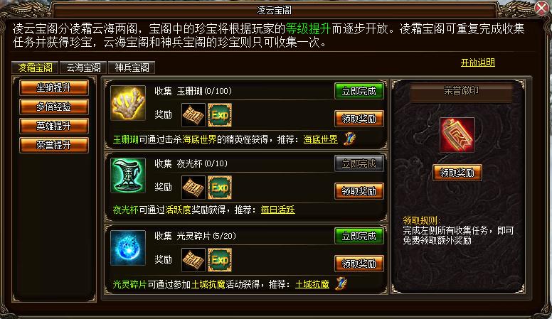 您是否为后期得不到自己想要的装备而烦恼,是否看到别人高级而炫丽的翅膀而惊动。如果您不是一个高级的人民币玩家,凌云宝阁将为您追赶高级玩家的提供有力的保障,凌云宝阁里珍藏了各类珍稀道具,包括:高级装备、翅膀、足迹和幻武等等。只要您每天花一定的时间,收集一定数量的指定物品上交到凌云宝阁即可获得装备、翅膀、足迹、幻武等珍贵物品。使你的战力迅速提升。