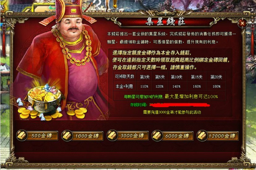 *充值3000金砖才能参与此活动,向钱庄存钱的金额不计为钱庄的消费任务的金砖计算中。