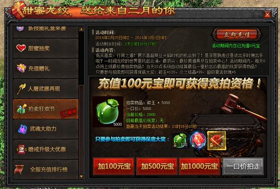 4)每次加价分为三档:100元宝,500元宝,1000元宝
