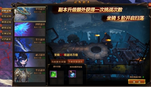 试练副本有各种不同的试练内容,不同的试练副本主要掉落相应不同的道具,是每天必须完成的一项目标之一;