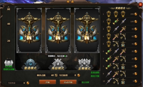 玩家每天获得20点消耗值,玩家选择不同模式,消耗消耗值不一样,奖励也有所区别