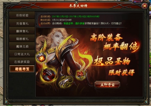 活动说明:活动期间,众神宝藏大放送,极品圣器、高阶装备抽取概率翻倍,限时4天,切勿错过!