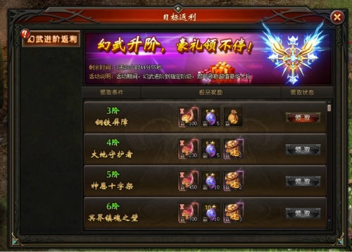 活动说明:活动期间,幻盾进阶到指定阶级,可领取超值豪华大礼;
