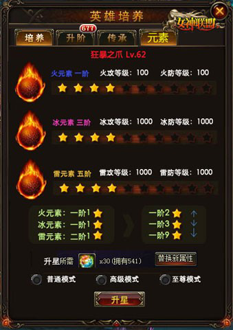 在元素培养系统中,英雄可使用“元素之力”道具对元素进行培养,提升元素属性的星级。不断升级的元素,达到指定星级将获得升阶。每个元素有星级、星阶和品质之分。元素通过不断的升级将会获得更高属性作用。