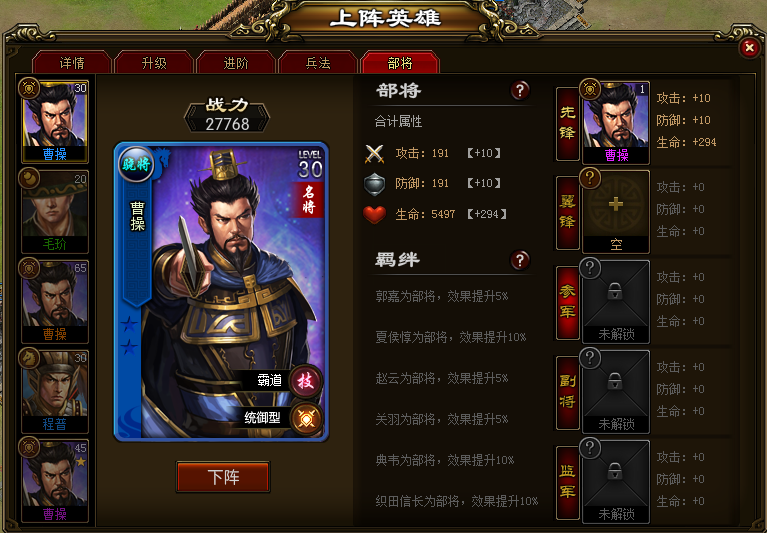 【羁绊关系】 拥有羁绊关系的部将所提供的属性更多。