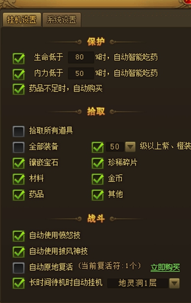 挂机系统怎么设置,如何快速挂机: 玩家可以点击右下方“挂机”按钮或者使用快捷键A人物自动在周围挂机打怪 点击右上角小地图下方设置按钮,即可设置自动挂机功能 在挂机设置界面当中,你可以对自动吃药、自动拾取、自动释放技能等进行设置。