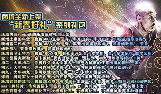 新增土豪的年货,售价6888点券,有几率开出有几率开出15级戒指修改券,16级戒指修改券,17级戒指修改券,18级戒指修改券,19级戒指修改券,20级戒指修改券。