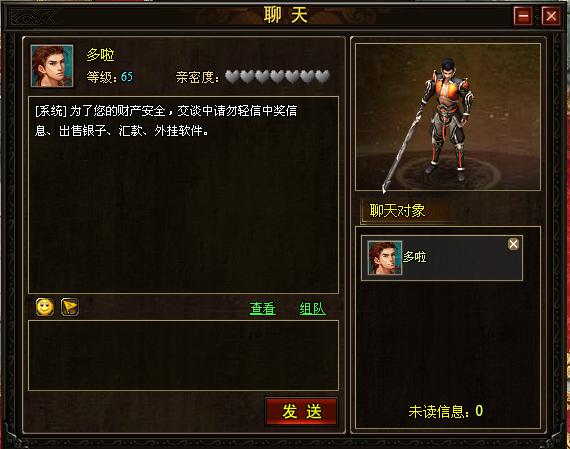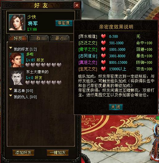玩家可以在游戏添加多个好友,游戏中的好友是双向好友。 玩家可以和好友进行互动聊天。如果被骚扰了,可以将好友加入黑名单。 玩家可拥有好友的数量有限制,VIP玩家可拥有好友数量上限更高。 对于恶意PK的玩家,还可以将其加入仇人名单。 好友之间送花、组队杀怪、打坐双休还可以增加亲密度,当亲密度达到一定数值时,与该好友组队可以获得属性加成。