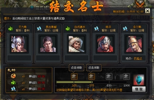 1、结交名士奖励:每次结交名士,可随机获得经验、粮食、铁矿、兵营令的其中一种