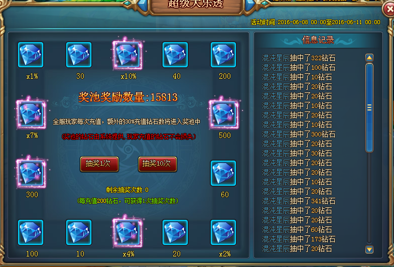 活动开启期间,全服每个玩家每次充值,额外30%的钻石将滚入奖池中。