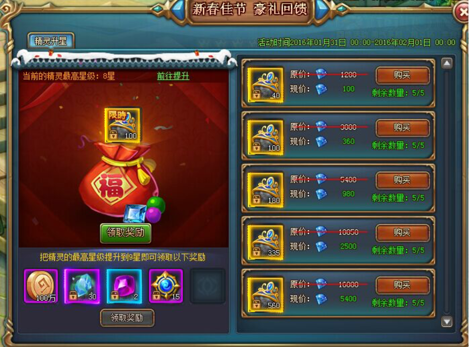 活动说明:1、活动开始期间,根据玩家的觉醒等级或者精灵星级,生成若干限购豪华超值礼包。