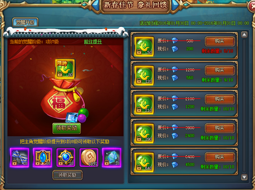 1、活动开始期间,根据玩家的觉醒等级或者精灵星级,生成若干限购豪华超值礼包。