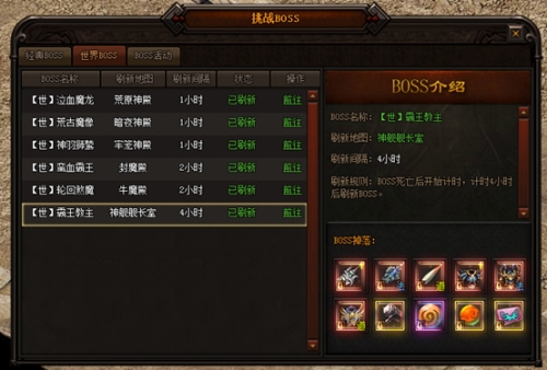 玩家达到51级时,可开启挑战BOSS功能!通过此功能,玩家可以查询游戏中的经典BOSS、世界BOSS的具体信息!还能进入特殊BOSS地图,猎它们,获得强大的装备和稀有的道具!当然了,他们的实力都是强大无匹的,勇士可要磨亮自己的武器哦!
