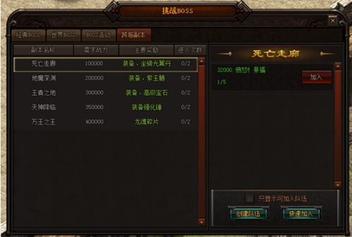 点击右上角的“挑战BOSS”便可开启跨服副本组队界面。每个副本最少需要2个人才能进入,最多可容纳5人!好的阵容可以让你的队伍事半功倍!